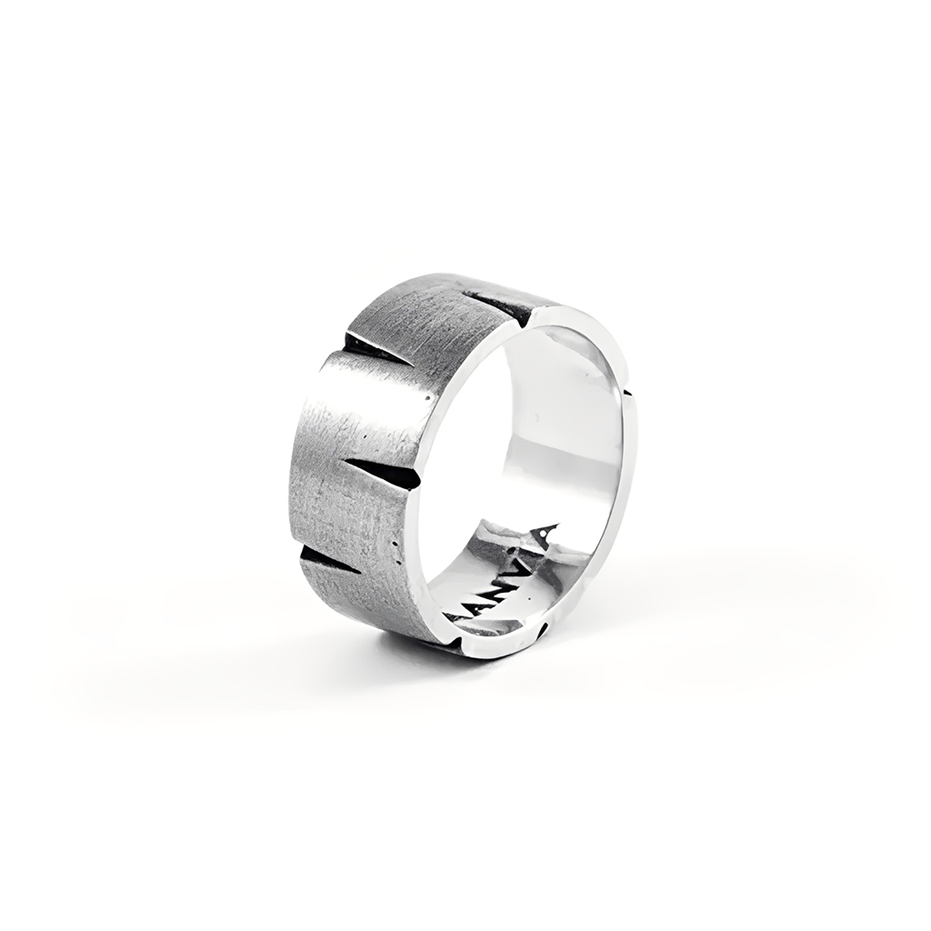 Anel unissex feito em prata 950 com acabamento fosco e cortes geométricos que trazem um visual moderno e marcante.
