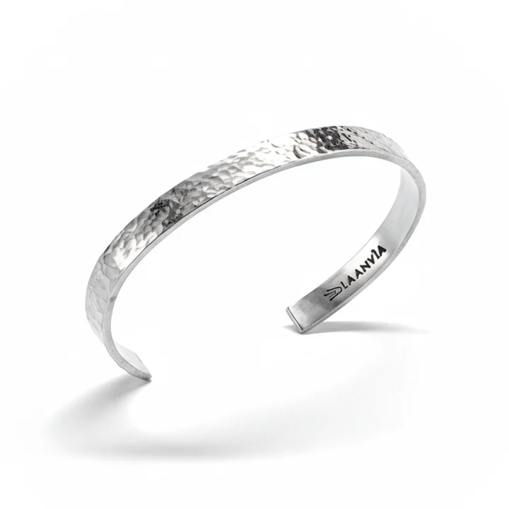 Pulseira unissex feita em prata 950 com acabamento martelado artesanal. O design minimalista e o brilho natural da prata criam um visual moderno e versátil, ideal para o uso diário ou ocasiões especiais.